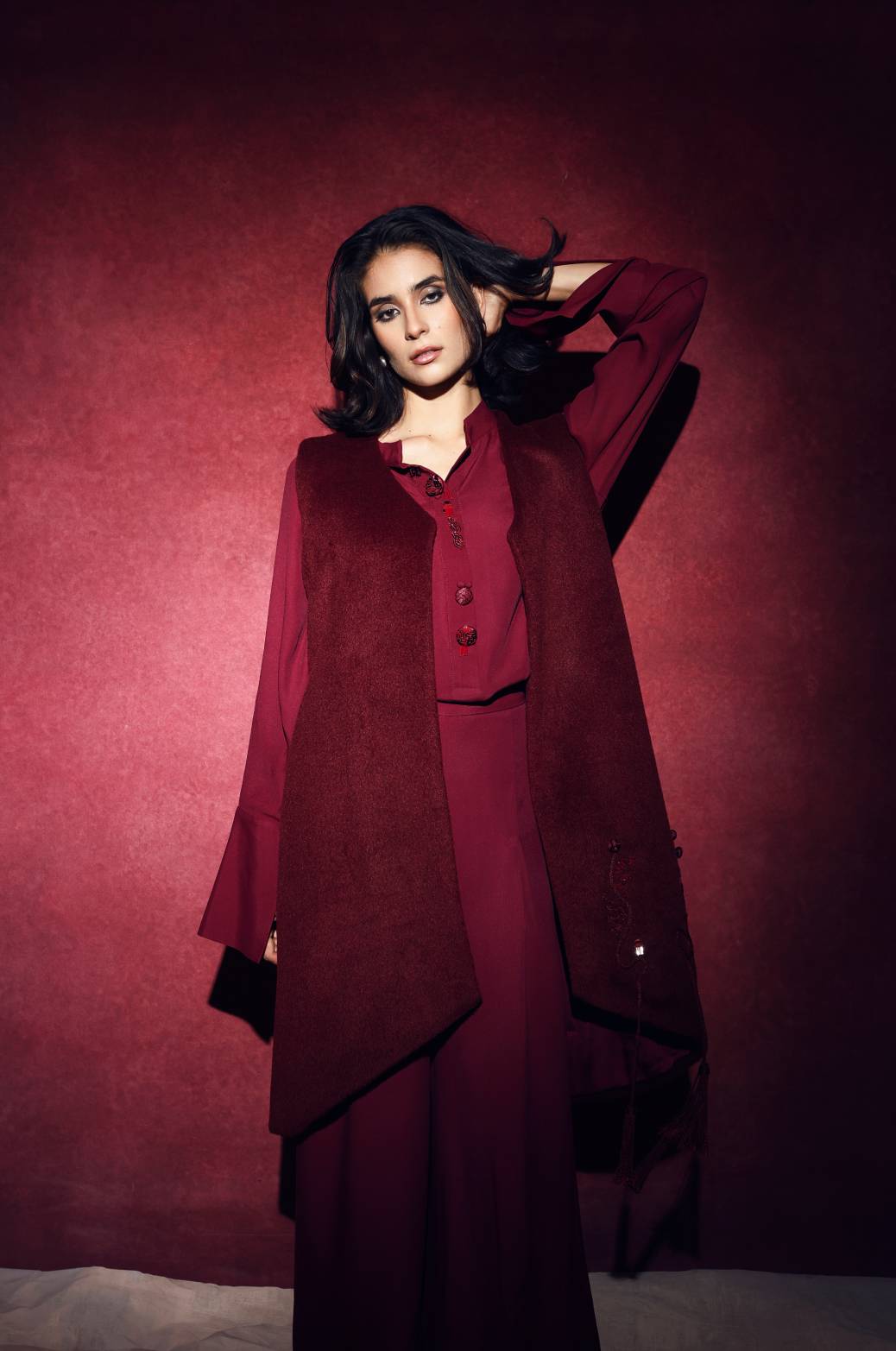 A timeless sleeveless wool vest that combines structure and craftsmanship. Its clean silhouette is elevated by a hand-embroidered Moroccan pocket, adorned with delicate cord detailing and tassels. Layered over a soft ivory blouse.
